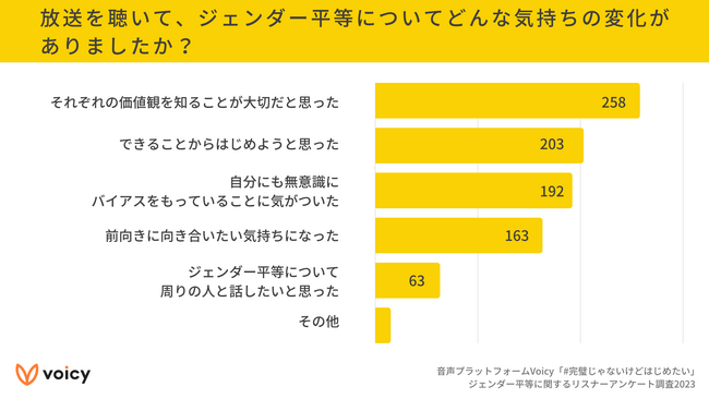 「放送を聴いて、ジェンダー平等についてどんな気持ちの変化がありましたか?」という質問に対し、最も多かったのは「それぞれの価値観を知ることが大切だと思った」、次に「できることからはじめようと思った」という回答結果になりました。