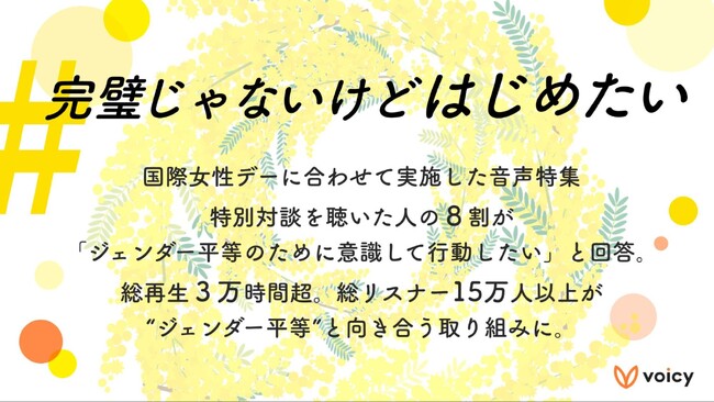 Voicyは、3月8日の国際女性デーに合わせて音声特集「#完璧じゃないけどはじめたい」を実施しました。「#完璧じゃないけどはじめたい」というトークテーマで、ジェンダー平等のために意識したい職場や家庭でのコミュニケーション方法や、キャリアの考え方、理解し合うためのヒントをVoicyパーソナリティが独自の視点で語る放送を集めました。また、トークテーマにあわせて3つの特別対談を企画、それぞれの切り口でジェンダー平等や女性活躍について語られました。これらの放送の総再生時間は3万時間を超え、放送を聴いた総リスナー15万人超とトークテーマを放送した200以上のチャンネルをもつパーソナリティがジェンダー平等と向き合いました。