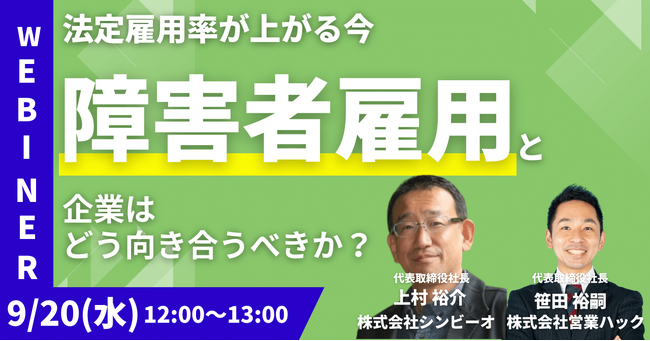 営業代行を通して営業支援を行う株式会社営業ハック(本社:東京都港区・代表:笹田裕嗣)と株式会社シンビーオ(本社:東京都港区・代表:上村裕介)が共催でウェビナーを行います。日時は2023年9月20日(水) 12:00~13:00、参加費は無料です。