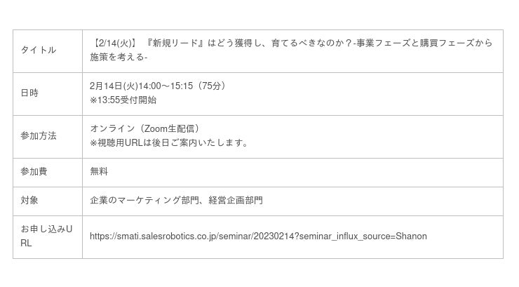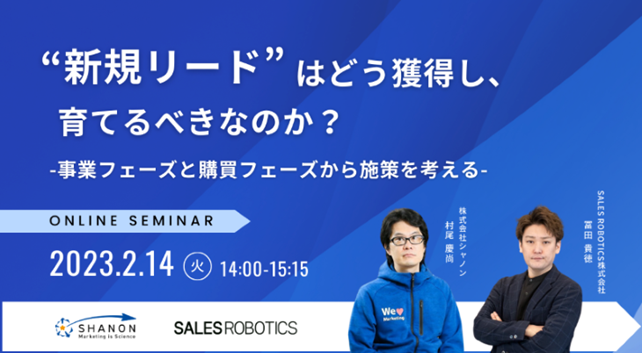 株式会社シャノン(本社:東京都港区、代表取締役社長:中村 健一郎)は、SALES ROBOTICS株式会社と「新規リードの獲得」について解説するウェビナーを2月14日(火)に開催します。