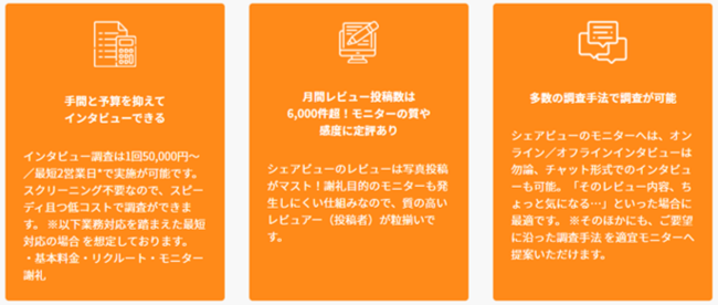 シェアビューインタビューとは、食品・日用品を中心とした様々な商品について、実際に使用した一般消費者のレビュー(感想)から、インタビューや各種調査のリクルートができる、アスマーク独自のサービスです。 リクルートしたモニターへはオフライン/オンラインインタビューやチャットでの調査が可能。協力率や回答の質の高いモニターを、スクリーニングなしで直ぐにお選びいただける、アスマークオリジナルの新しい調査形態です。