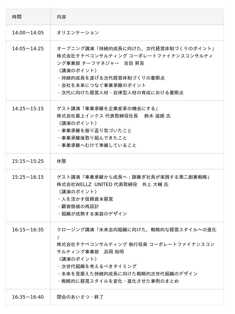 本フォーラムでは、ゲストとして株式会社最上インクス 代表取締役社長 鈴木 滋朗 氏と、株式会社WELLZ UNITED 代表取締役 井上 大輔 氏をお迎えし、事業承継を成長の機会として捉え、経営スタイルを変革した事例や成功のポイントについて、現場のリアルな声をお届けいたします。また、株式会社タナベコンサルティング コーポレートファイナンスコンサルティング事業部 執行役員 浜岡 裕明、チーフマネジャー 吉田 昇吾が登壇し、戦略的な経営スタイルの変革・進化のあり方について深く探ります。