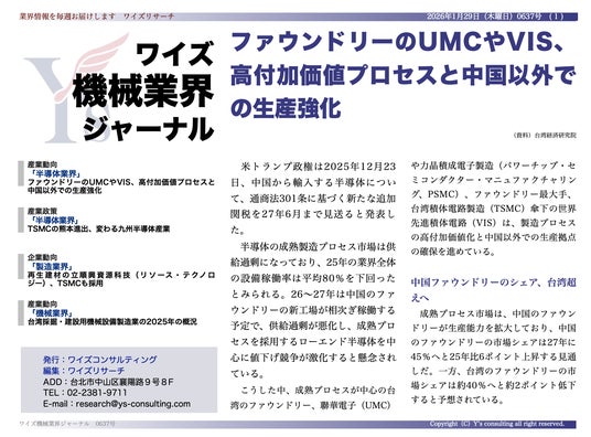 ワイズコンサルティング グループ(本社:中華民国台北市、代表取締役:吉本康志)は台湾機械業界専門誌「ワイズ機械業界ジャーナル」の2026年1月第4週号を発行しました。