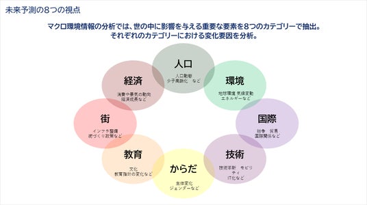 【レポート詳細】<マクロ環境情報分析>マクロ環境情報の分析では、世の中に影響を与える重要な要素を8つのカテゴリーで抽出しています。それぞれのカテゴリーごとに抽出した公的データに基づくファクトから、未来に起こりうる変化を分析しました。