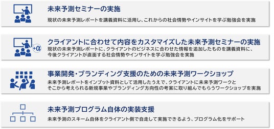 この「未来レポート」を用いて、マクロな未来視点からコミュニケーション領域に限らず、事業戦略や商品開発など、さまざまな課題解決のお手伝いをいたします。