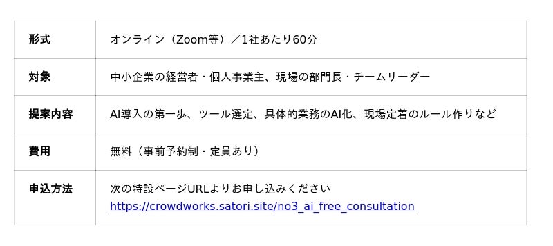 ▼「AI実装伴走プラン」詳細・お申し込みhttps://crowdworks.satori.site/no3_ai_free_consultation20社限定で、特別価格 11万円(税込)から提供(*2)
