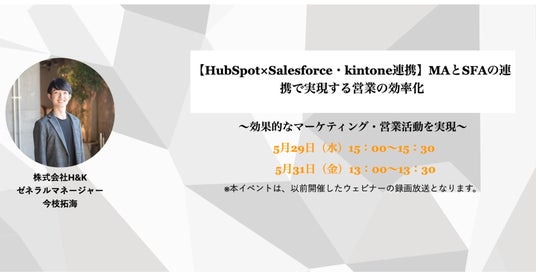 企業のマーケティング、DX化などの支援を行う株式会社H&K(本社:神奈川県横浜市、支店:茨城県土浦市、代表取締役CEO:安藤弘樹)が、2024年5月29日(水)、5月31日(金)に、「【HubSpot×Salesforce・kintone連携】MAとSFAの連携で実現する営業の効率化」について語るイベントを開催することとなりましたので、ご案内いたします。