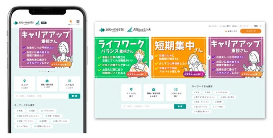 アルティウスリンクアルティウスリンク株式会社(所在地:東京都新宿区、代表取締役社長:網野 孝、以下 アルティウスリンク)は、コンタクトセンターやバックオフィス業務における、契約社員・アルバイト・派遣社員中心の求人サイト「job-meets(TM)(ジョブミーツ)」を公開しました。これまで運営してきた月間UU(ユニークユーザー)数 合計約21万(※1)・業界最大級の求人サイト「エボジョブ」と「ジョブポケット」を統合・リニューアルして、月間最大1,100件超(※2)の求人をご用意し、さまざまな働き方を希望する求職者の効率的なお仕事探しをサポートいたします。