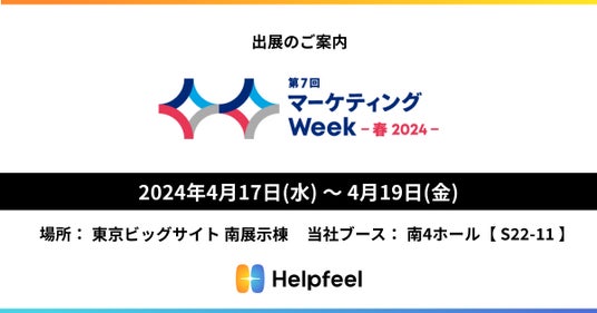 株式会社Helpfeel(京都府京都市、代表取締役/CEO:洛西 一周、以下 当社)は、2024年4月17日(水)~4月19日(金)に東京ビッグサイトで開催される日本最大級のマーケティングの総合展示会「第7回 マーケティングWeek -春 2024-」に出展することをお知らせします。