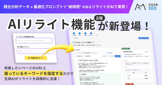株式会社Faber Company(本社:東京都港区、代表取締役:稲次正樹、古澤暢央)は、SEOプラットフォーム「ミエルカSEO」において、改善したいページと狙うキーワードを指定するだけで、生成AIが戦略立案から文章改善までを一貫して支援する新機能「AIリライト機能」のβ版をリリースしたことをお知らせします。