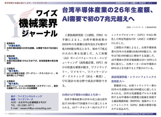 ワイズコンサルティング グループ(本社:中華民国台北市、代表取締役:吉本康志)は台湾機械業界専門誌「ワイズ機械業界ジャーナル」の2026年2月第1週号を発行しました。