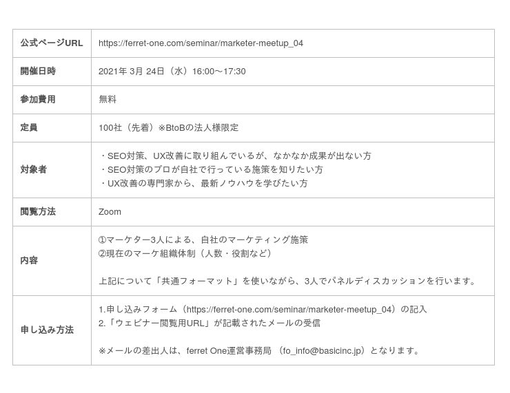 株式会社ベーシック(本社:東京都千代田区、代表取締役:秋山勝、以下ベーシック)は3/24(水)16時より、BtoB事業のWebマーケティング、SEO、UX担当者向けのイベント「MARKETER MEETUP ONLINE #04」を開催することをお知らせいたします。