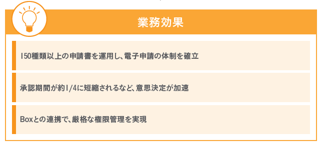 さらに、直近ではAgileWorksとストレージツールの「Box」との連携も実現し、文書の閲覧権限の管理強化も図っています。一部の機密性の高い文書については、承認後にAgileWorksからBoxに自動連携し、個別に閲覧権限を設定することで、厳密な情報管理とシステム運用の効率化を両立されています。