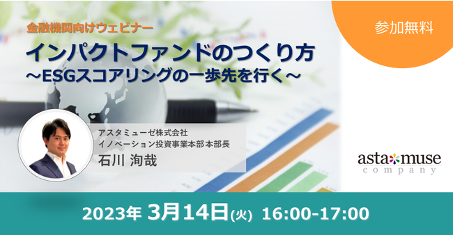 アスタミューゼ株式会社(本社:東京都千代田区、代表取締役社長 永井歩)は、2023年3月14日(木)16時より、「インパクトファンドのつくり方~ESGスコアリングの一歩先を行く~」と題し、金融機関向け無料ウェビナーを開催いたします。
