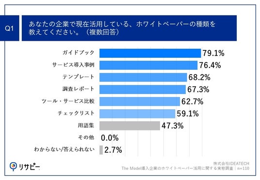 「Q1.あなたの企業で現在活用している、ホワイトペーパーの種類を教えてください。(複数回答)」(n=110)と質問したところ、