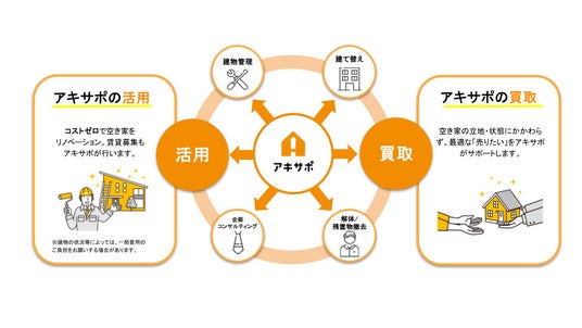 空き家のお悩みに対して「アキサポ」が寄り添い、活用や買取などのさまざまな選択肢の中から最適なプランをご提案、所有者様の手間なく、お悩みを解決いたします。創業時より大切にしている物件の多様化(不動産それぞれの土地や周辺のニーズに合わせた活用方法)を最大限に活かした事業を目指し、2016年にスタートしました。