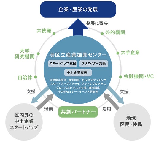 共創パートナーとは、様々なステークホルダーの取組みの輪がセンターをハブに加速度的かつ自走的に広がっていき、地域のみならず全国の経済産業を活性化させるとともに、センターにおけるネットワーク形成や広報力強化の取組効果を発揮します。企業や大学・研究機関、大使館、金融機関、投資機関等と連携し、社会課題解決に通じる事業領域の活性化を目指します。