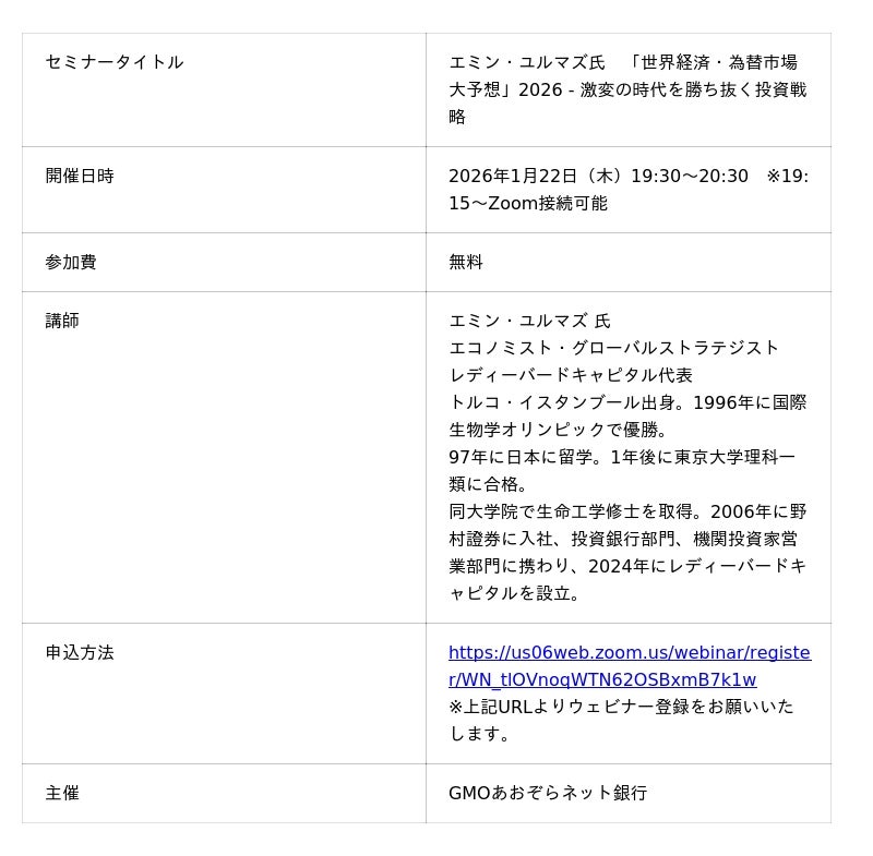 GMOあおぞらネット銀行株式会社 GMOあおぞらネット銀行株式会社(以下、当社)は、2026年1月22日(木)19:30より、人気エコノミスト・為替ストラテジストのエミン・ユルマズ氏を講師にお迎えして、「エミン・ユルマズ氏 「世界経済・為替市場 大予想」2026 - 激変の時代を勝ち抜く投資戦略」と題した、無料オンラインセミナーを開催します。