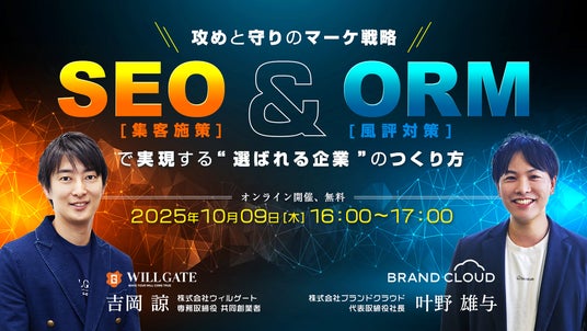 株式会社ウィルゲート(本社:東京都港区、代表取締役:小島 梨揮、以下 ウィルゲート)は、株式会社ブランドクラウド(本社:東京都港区、代表取締役社長:叶野 雄与)と共同で、無料オンラインセミナー『攻めと守りのマーケ戦略──SEO(集客施策)とORM(風評対策)で実現する“選ばれる企業”のつくり方』を10月9日(木)16時より開催いたします。(申込み先: