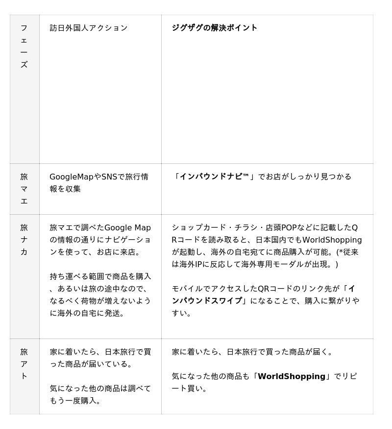 ジグザグは、お店の情報から商品の紹介まで、商材に限らずインバウンド需要に合った“旅マエ・旅ナカ・旅アト”導線を提供いたします。