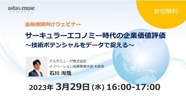 アスタミューゼ株式会社(本社:東京都千代田区、代表取締役社長 永井歩)は、3月29日16時より、「サーキュラーエコノミー時代の企業価値評価~技術ポテンシャルをデータで捉える~」と題し、無料ウェビナーを開催いたします。