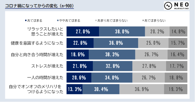 コロナ禍になってからの変化についてお聞きすると、「リラックスしたいと思うことが増えた」計65.0%、「健康を意識するようになった」計59.3%、「自分と向き合う時間が増えた」計56.9%、「一人の時間が増えた」計54.6%、「ストレスが増えた」計54.6%、「自分でオンオフのメリハリをつけるようになった」計43.8%が「あてはまる」と回答しました。新型コロナウイルスの影響で様々な変化があったようです。リモートワークや外出自粛などに伴い、ストレスが増え、リラックスしたいと考える方も多いのではないでしょうか。