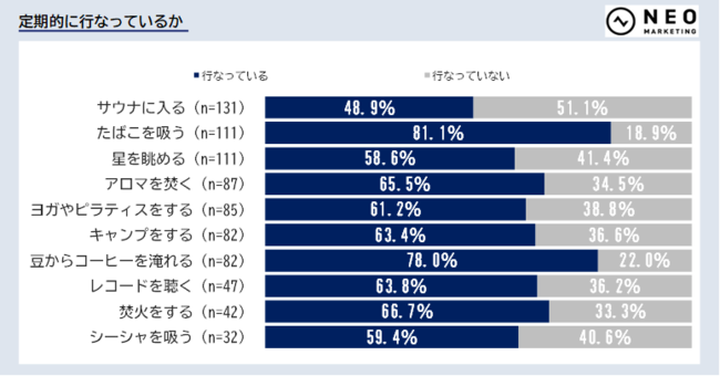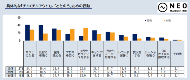 実際に、「チル(チルアウト)」・「ととのう」ために行なったことがあるものをお聞きすると、男性は「サウナに入る」41.1%が最も多く、次いで「たばこを吸う」40.5%、「星を眺める」31.1%と続きます。女性は「ヨガやピラティスをする」が最も多く33.0%となり、次いで「アロマを焚く」29.3%、「サウナに入る」28.2%という順になりました。男女で「チル」や「ととのう」ための行動が違うことがわかりました。