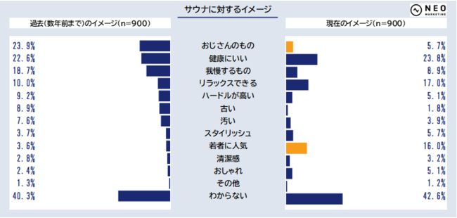 「チル」や「ととのう」ために行なったことがあると回答した方が最も多い「サウナ」に関して、過去と現在のイメージをそれぞれお聞きしました。その結果、「おじさんのもの」というイメージだったサウナが「若者に人気」というイメージに変化していることがわかりました。