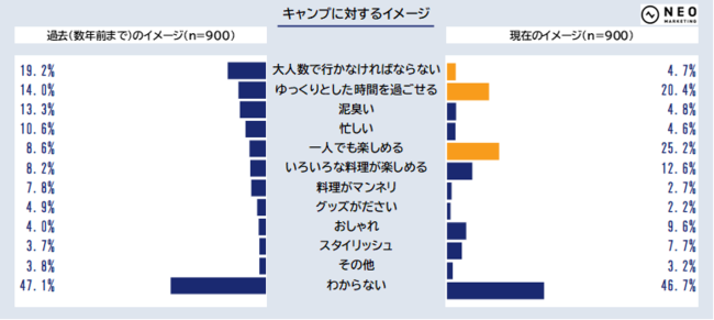 「キャンプ」においては、「大人数で行かなければならない」ものから、「一人でも楽しめる」ものに変化しているようです。そのためか、「ゆっくりとした時間を過ごせる」というイメージも増加しています。