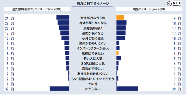 ヨガに対するイメージは「女性が行なう」というイメージが減り、男女ともに行なうものであるというイメージに変化した方が多いようです。また、「気楽にできない」とのイメージも減っており、気軽にできるというイメージに変化してきているようです。