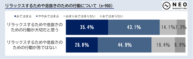 また、リラックスするためや息抜きのための行動が大切だと思うと計78.6%が回答し、リラックスするためや息抜きのための行動が苦ではないと計71.7%が回答しました。あえてアクションを起こし能動的に休息系趣味・娯楽を楽しむ方も多いのではないでしょうか。