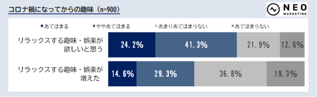 コロナ禍での生活が大きく影響したからでしょうか、リラックスする趣味・娯楽が欲しいと考える方も計65.6%となりました。実際に計43.9%はリラックスする趣味・娯楽が増えているようです。