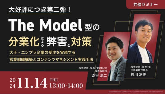 ファクトに基づいたコンテンツ開発とマーケティング支援を行う、株式会社IDEATECH(本社:東京都港区、代表取締役社長:石川友夫)は、株式会社Leader Partners(本社:東京都渋谷区、代表取締役:染谷 滉二)と共同で、2024年11月14日(木)13:00-14:00に「The Model型の分業化による弊害と対策 ~顧客視点の営業組織・コンテンツマネジメントが成功のカギ~」と題するオンラインセミナーを開催いたしますので、お知らせいたします。