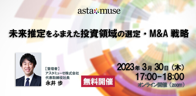 アスタミューゼ株式会社(本社:東京都千代田区、代表取締役社長 永井歩)は、2023年3月30日(木)17:00~18:00に、M&A等の投資部門、経営企画や事業企画、新規事業やR&D担当者の方々を対象とした無料ウェビナー「未来推定をふまえた投資領域の選定・M&A戦略」を開催いたします。