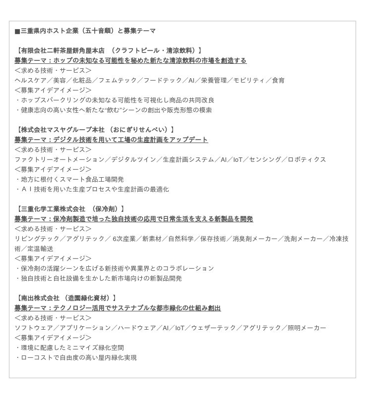 全国のパートナー企業 × 三重県内企業と共に創るビジネス創出プログラム。三重県内企業4社が共創パートナーを募集!応募締切2022年9月19日