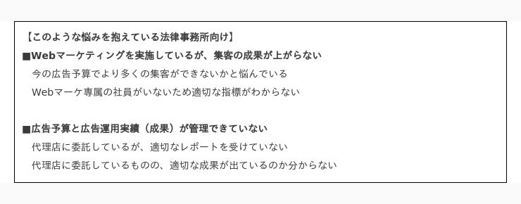 「弁護士広告規定とWebマーケティングの両方に精通した人材がおらず、効率的かつ効果的な集客ができていない。代理店に依頼しているものの、適切な成果が出ているのか分からない」というお悩みがよく見受けられます。