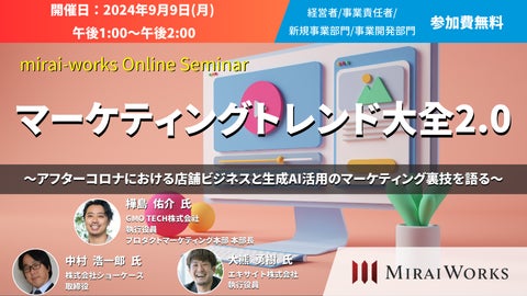 株式会社みらいワークス(本社:東京都港区、代表取締役社長 岡本 祥治、以下「当社」)は、2024年9月9日(月)に「アフターコロナにおける店舗ビジネスと生成AI活用のマーケティング」における、対談形式でのオンラインセミナーを開催します。