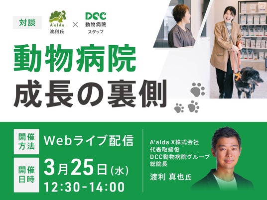 M&Aにより全国各地の動物病院をグループに迎え入れてきたA'aldaグループ。本セミナーでは、2023年1月にアルダグループが事業承継し、本間獣医科医院からリブランディングした「DCC動物病院グループ」について、A'alda X株式会社 代表取締役でDCC動物病院グループ総院長の渡利真也氏と、DCC動物病院(旧:本間獣医科医院)の獣医師が対談形式で、M&A後の変化や現場のリアルな声をお届けします。