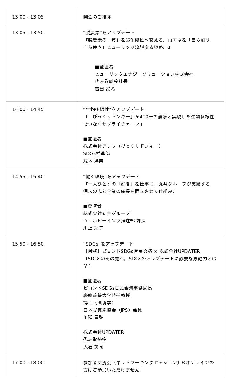 本イベント『UPDATERs DAY 2026』は、そんな「壁」に挑む実践者たちが一堂に会し、「これからのサステナビリティのあり方」を共に描き出すための「共創の場」です。エネルギーのあり方、自然との共生、そして働く人の幸せ―、それぞれの最前線で「本質」を追い続け、世界を前進させている「アップデーター」たちの「生の声」を共有するとともに、既存のSDGsの枠組みを超え、2030年のその先を見据えた「ビヨンドSDGs」を探求します。