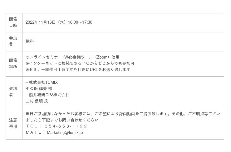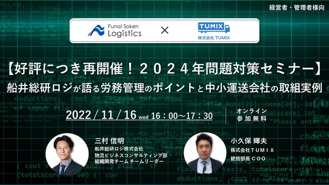 ロジスティクス・物流コンサルティングサービスを提供する船井総研ロジ株式会社(東京本社:東京都千代田区、代表:菅重宏、以下「船井総研ロジ」)のコンサルタントが、2022年11月16日(水)16:00~17:30に無料オンラインセミナー「【好評につき再開催!2024年問題対策セミナー】 船井総研ロジが語る労務管理のポイントと中小運送会社の取組実例」にて講演いたします。