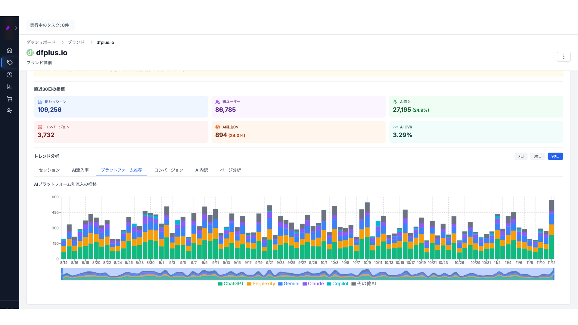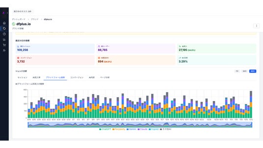 「Perplexityスコアは高いがサイト流入は少ない」「ChatGPTは流入数は多いがコンバージョン率が低い」といったチャネル別のギャップを発見し、どのAIプラットフォームへの対策を優先すべきかをデータドリブンに判断できます。