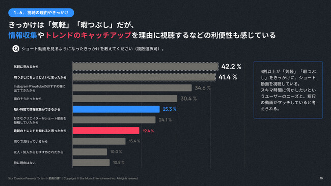 また、全体の25.3%が「短い時間で情報を収集できるから」と回答、19.4%が「最新のトレンドを知れると思ったから」と回答するなど、情報収集やトレンドのキャッチアップを理由に視聴するなどの利便性も感じています。