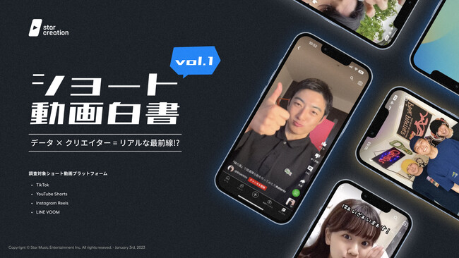 株式会社スターミュージック・エンタテインメント(本社:東京都渋谷区 代表取締役:渡邊祐平 以下、「当社」)が運営するStar Creationは、ショート動画の主要4プラットフォームを調査したレポート『ショート動画白書(Vol.1)~データ×クリエイター=リアルな最前線!?~』を公開します。調査結果レポートは、ショートムービーラボ(https://shortmovie.jp/document/white-paper-vol1/)から無料でダウンロードいただけます。