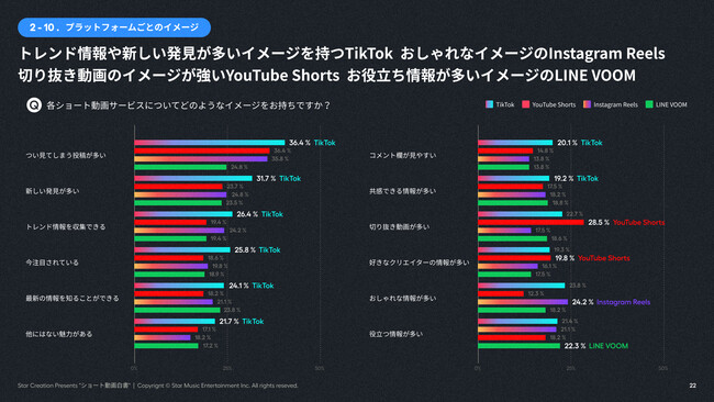 トレンド情報や新しい発見が多いイメージを持つTikTok、おしゃれなイメージのInstagram、切り抜き動画のイメージが強いYouTube Shorts、お役立ち情報が多いイメージのLINE VOOMなど各プラットフォームに個性が出始めています。