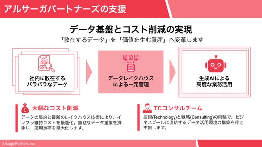 1. データ基盤の構築とコスト削減の実現社内に散在する「バラバラなデータ」を、ビジネスの価値を生む資産へと変革。データレイクハウス技術を用いてデータを一元管理することで、生成AIによる高度な業務活用を可能にします。