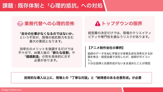 生成AI導入の推進において、小俣は極めて難易度の高い2つの課題を挙げました。それが、「