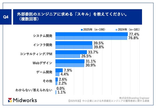 「Q4. Q1で「かなり意欲が高い」「やや意欲が高い」と回答した方にお聞きします。外部委託のエンジニアに求める「スキル」を教えてください。(複数回答)」(n=190)と質問したところ、