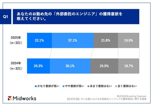 株式会社TWOSTONE&Sonsのグループ会社である株式会社Branding Engineer(本社:東京都渋谷区、代表取締役CEO:大島 孝之、以下Branding Engineer)が運営するフリーランスエンジニアと企業のマッチングサービス「Midworks」は、システム開発を行っている中小企業(従業員数500名未満)の経営者・役員321名を対象に、中小企業における外部委託エンジニアの獲得意欲に関する調査を実施しましたので、お知らせいたします。