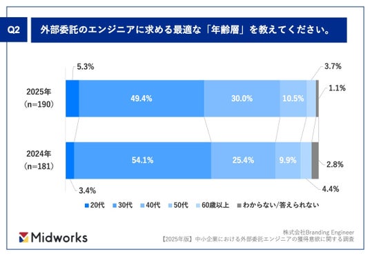 Q2. Q1で「かなり意欲が高い」「やや意欲が高い」と回答した方にお聞きします。外部委託のエンジニアに求める最適な「年齢層」を教えてください。