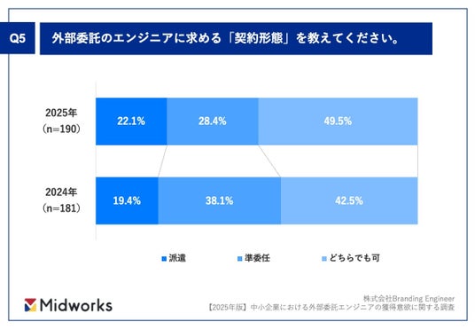 「派遣」が22.1%、「準委任」が28.4%、「どちらでも可」が49.5%という回答となりました。
